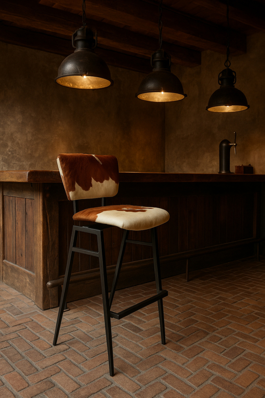 Gerrit industriële barkruk, bruin met wit koeienhuid